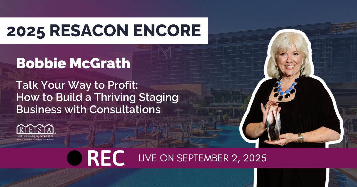 At RESACON 2025, Bobbie will present “Talk Your Way to Profit: How to Build a Thriving Staging Business with Consultations.” You’ll gain confidence, clarity, and a profitable new approach to growing your business by making consultations your centerpiece. Her accolades include RESA’s Lori Kim Polk Lifetime Achievement Award and Kathy Nielsen Spirit Award, and her impact on the staging industry continues to grow through her mentorship, training, and innovative consultation systems.